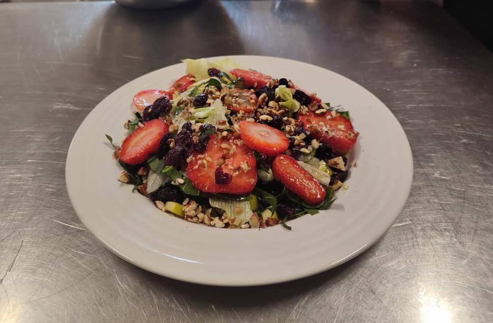 - Mezclar los ingredientes, agregar pasas, arándanos y la vinagreta a gusto.1 manojo de espinacas, 2 manzanas amarillas, 50 gr pasas, 50 gr arandonos, 250 gr fresas
