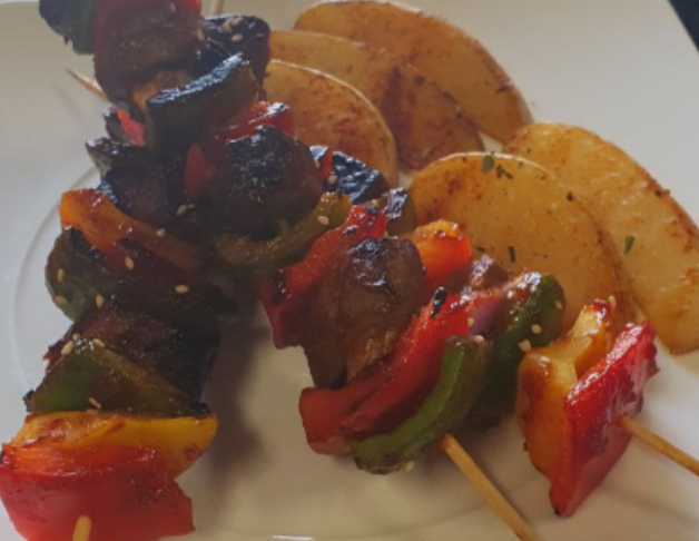 1 kg de carne de res pulpa negra, 2 pimientos rojos, 2 pimientos verdes, 3 cebollas, 20 palitos grandes para brochetas