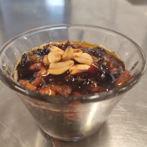 Colocar los chiles tostados en el vaso de una licuadora o procesador de alimentos y agregar la mezcla de aceite, ajo, piloncillo, cacahuetes y vinagre a la licuadora.