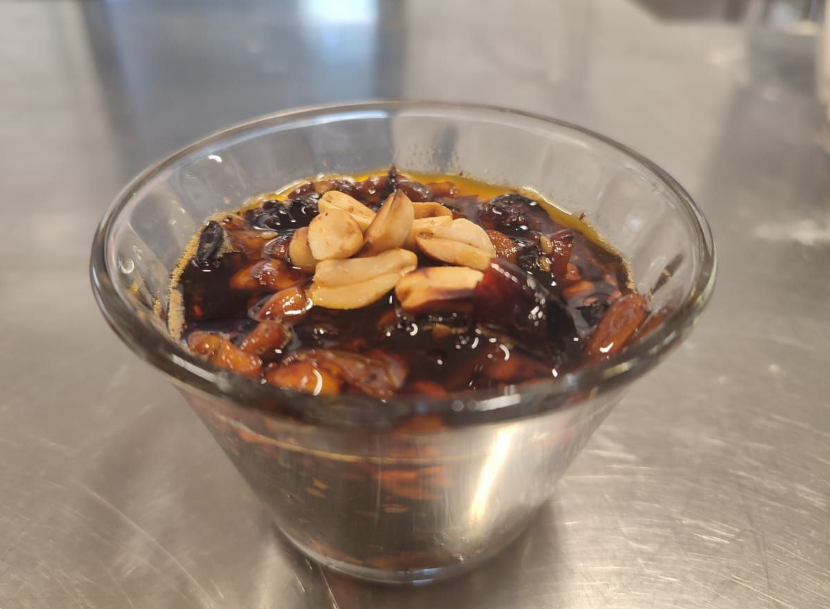 Agregar los cacahuetes tostados a la mezcla y cocinarlos por unos minutos mas hasta que estén ligeramente dorados.