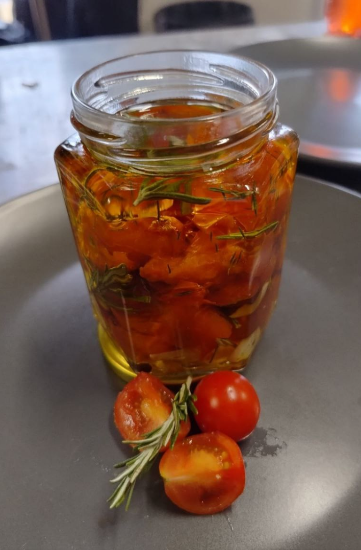 Cubrir los tomates cherry y los ajos con aceite de oliva virgen.