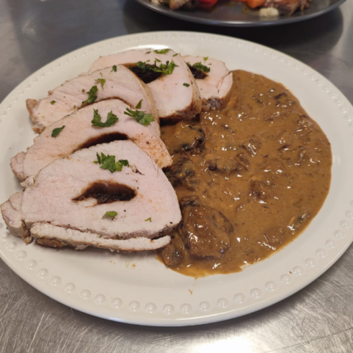 Cortar la carne y servir la salsa, decorar con el perejil finamente picado.