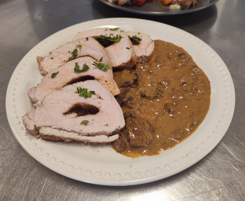 600 grs de filete o lomo de cerdo delgado, 200 grs ciruelas deshuesada o ciruela desidratada grande, Sal, Pimienta