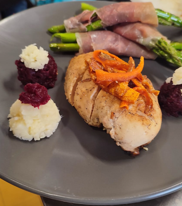 Pechuga de pollo al limón con puré de coliflor y espárragos salteados